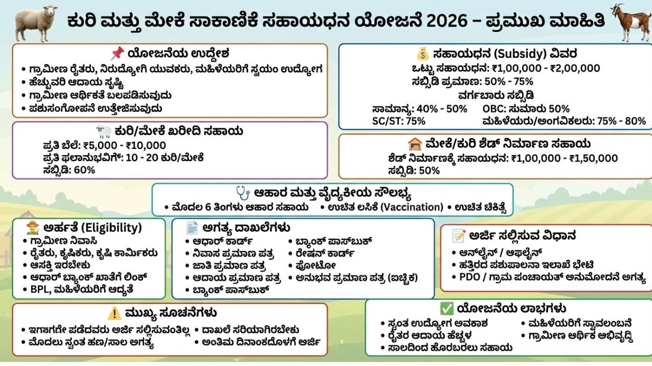 ಸರ್ಕಾರವು ಬಡವರಿಗೆ ಹಾಗೂ ಸಾಮಾನ್ಯ ವರ್ಗದ ರೈತರಿಗೆ ಅನುಕೂಲ ವಾಗುವಂತಹ ಹಲವು ಯೋಜನೆಗಳನ್ನು ಜಾರಿಗೆ ತಂದಿದೆ ಸೌಲಭ್ಯ ಪಡೆದುಕೊಂಡಿದ್ದಾರೆ ಅದೇ ನಿಟ್ಟಿನಲ್ಲಿ ಸರ್ಕಾರ 2026ರ ಸಾಲಿನಲ್ಲಿ ಕುರಿ ಮತ್ತು ಮೇಕೆ ಸಾಕಾಣಿಕೆಗೆ ಹಾಗು ಮೇಕೆ ಶೇಡ್ ನಿರ್ಮಾಣಕ್ಕೆ ಭರ್ಜರಿ ಸಬ್ಸಿಡಿ ಮೊತ್ತವನ್ನು ಬಿಡುಗಡೆ ಮಾಡಿದೆ. ರೈತರು ತಮ್ಮ ಹತ್ತಿರದ ಪಶು ಪಾಲನಾ ಕಚೇರಿಗೆ ಗ ಅಗತ್ಯ ದಾಖಲೆಗಳೊಂದಿಗೆ ಭೇಟಿ ನೀಡಿ ಸರ್ಕಾರವು ನಿಗದಿಪಡಿಸಿದ ಅಂತಿಮ ದಿನದೊಳಗಾಗಿ ಅರ್ಜಿಯನ್ನ ಸಲ್ಲಿಸಿದರೆ ಮಾತ್ರ ₹2,0,000/-ವರೆಗೆ ಸಹಾಯಧನ ಪಡೆಯಬಹುದು.