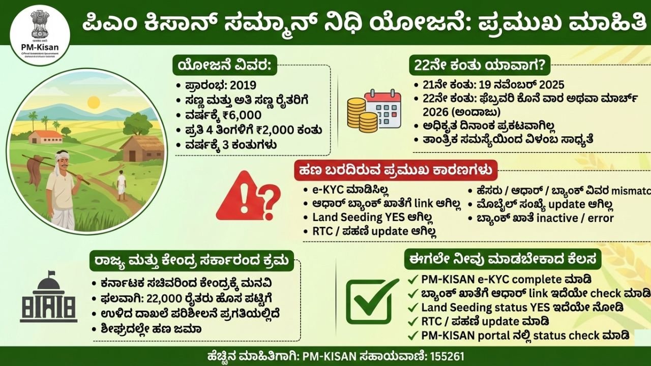ಕೇಂದ್ರ ಸರ್ಕಾರದ ಪಿಎಂ ಕಿಸಾನ್ ಸಮ್ಮಾನ್ ನಿಧಿ ಯೋಜನೆಯಡಿಯಲ್ಲಿ ಈಗಾಗಲೇ ಅಂದರೆ, ನವೆಂಬರ್ 19, 2025 ರಲ್ಲಿ 21 ನೇ ಕಂತಿನ ಹಣವನ್ನು ಮೊದಲ ವಾರದಲ್ಲೇ ಯಶಸ್ವಿಯಾಗಿ ಬಿಡುಗಡೆ ಮಾಡಲಾಗಿತ್ತು ಆದರೆ ರೈತರು ಇದೀಗ ಪಿಎಂ ಕಿಸಾನ್ 22 ನೇ ಕಂತಿನ ಹಣ ಯಾವಾಗ ಬಿಡುಗಡೆ ಆಗಲಿದೆ ಎಂದು ಕಾತುರದಿಂದ ಕಾಯುತ್ತಿದ್ದಾರೆ. ಈ ಹಣದಿಂದ ಮಾಧ್ಯಮ ವರ್ಗದವರಿಗೆ ಹಲವು ರೀತಿಯಲ್ಲಿ ಅನುಕೂಲವಾಗುತ್ತಲಿತ್ತು ಈ ತೋಟದ ಕೆಲಸ ಬೇಸಿಗೆ ಕಾಲ ಶುರುವಾಗಿದೆ ಪೈಪ್ ಲೈನ್ ಮಾಡಲು ಹಲವು ರೀತಿಯ ಸಮಸ್ಯೆ ಗಳಿಗೆಈ ಹಣವನ್ನು ಹೂಡಿಕೆ ಮಾಡುತ್ತಿದ್ದರು ಹೆಚ್ಚಿನ ಹೊಸ ಹೊಸ ಅಪ್ಡೇಟ್ ಗಳಿಗಾಗಿ ನಮ್ಮ ವೆಬ್ಸೈಟ್ ಮಾಧ್ಯಮ.ನೆಟ್ ಗೆ ಭೇಟಿ ನೀಡಿ.