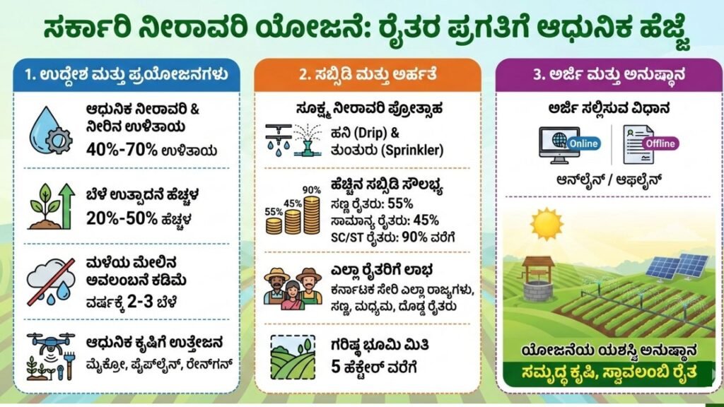 • ರೈತರಿಗೆ ಆಧುನಿಕ ನೀರಾವರಿ ವ್ಯವಸ್ಥೆಗಳು ಅಳವಡಿಸಲು ಸಬ್ಸಿಡಿ ನೀಡಲಾಗುತ್ತದೆ ಕೃಷಿ ಭೂಮಿಗೆ ನಿಯಮಿತವಾಗಿ ಮತ್ತು ಸಮರ್ಪಕವಾಗಿ ನೀರು ಒದಗಿಸಲು ಸಹಾಯ ಮಾಡುತ್ತದೆ ನೀರಿನ ಕೊರತೆ ಇರುವ ಪ್ರದೇಶಗಳಲ್ಲಿ ಕೃಷಿ ಮಾಡಲು ಅವಕಾಶ ಸಿಗುತ್ತದೆ ಅವಲಂಬನೆ ಕಡಿಮೆಯಾಗುತ್ತದೆ ಎಲ್ಲಾ ಬೆಲೆಗಳಿಗೆ ಸರಿಯಾದ ಪ್ರಮಾಣದಲ್ಲಿ ನೀರು ಒದಗಿಸಲು ಸಾಧ್ಯವಾಗುತ್ತದೆ