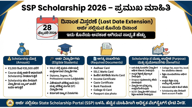 ಈ ವಿದ್ಯಾರ್ಥಿ ವೇತನ 20206ನೇ ಸಾಲಿನಲ್ಲಿ ಅನೇಕ ವಿದ್ಯಾರ್ಥಿಗಳು ಅರ್ಜಿ ಸಲ್ಲಿಸದೆ ಇರುವ ವಿಚಾರವನ್ನು ಅರಿತು ಸರ್ಕಾರ ಪ್ರಸ್ತುತ ಸಾಲಿನ ವಿದ್ಯಾರ್ಥಿ ವೇತನದ ಅರ್ಜಿ ಸಲ್ಲಿಸುವ ಅಂತಿಮ ದಿನಾಂಕವನ್ನು “28/02/2026 ವರೆಗೆ ವಿಸ್ತರಿಸಿದೆ” ಹಲವು ಕಾರಣಗಳಿಂದ ಈ “ಸ್ಕಾಲಸರ್ಕಾರ ರ್ಶಿಪ್ ಗೆ ಅರ್ಜಿ ಸಲ್ಲಿಸಲು ಸಾಧ್ಯವಾಗದೇ ಇರುವ ವಿದ್ಯಾರ್ಥಿಗಳಿಗೆ ಮತ್ತೊಂದು ಗೋಲ್ಡನ್ ಚಾನ್ಸ್ ಕೊಟ್ಟಿದೆ.